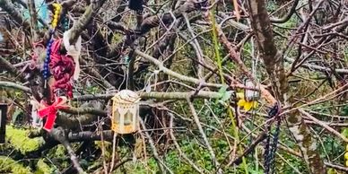 Holy wells and sacred trees go together perfectly for, like wells, trees have long been subjects of devotion and mystery. Found together they present a powerful and striking unity. In the ancient valley of Gleann na nGealt in Co.Kerry there lies the sacred lithium well. Next to the well dwells the wishing tree. Laden with trinkets, ribbons, medals and bits of materials left behind as wishes and thanks for the cures that the well water brings. This old wishing tree lives off the purest water in the land and those who drink from her well and place a wish on her tree will manifest their destiny. Wishing trees are places where people can reconnect to things that truly matter to them. It would be lovely to think that when a wish is granted it is magically released from the tree.